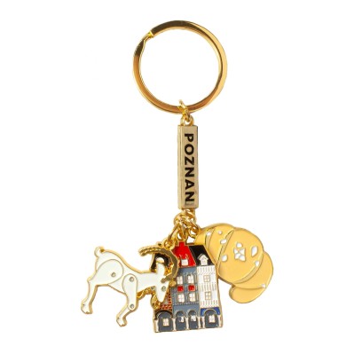Brelok emaliowany z symbolami Poznania - koziołkiem, rogalem świętomarcińskim, oraz domkami budniczymi - zespołem kamieniczek na poznańskim Starym Rynku.